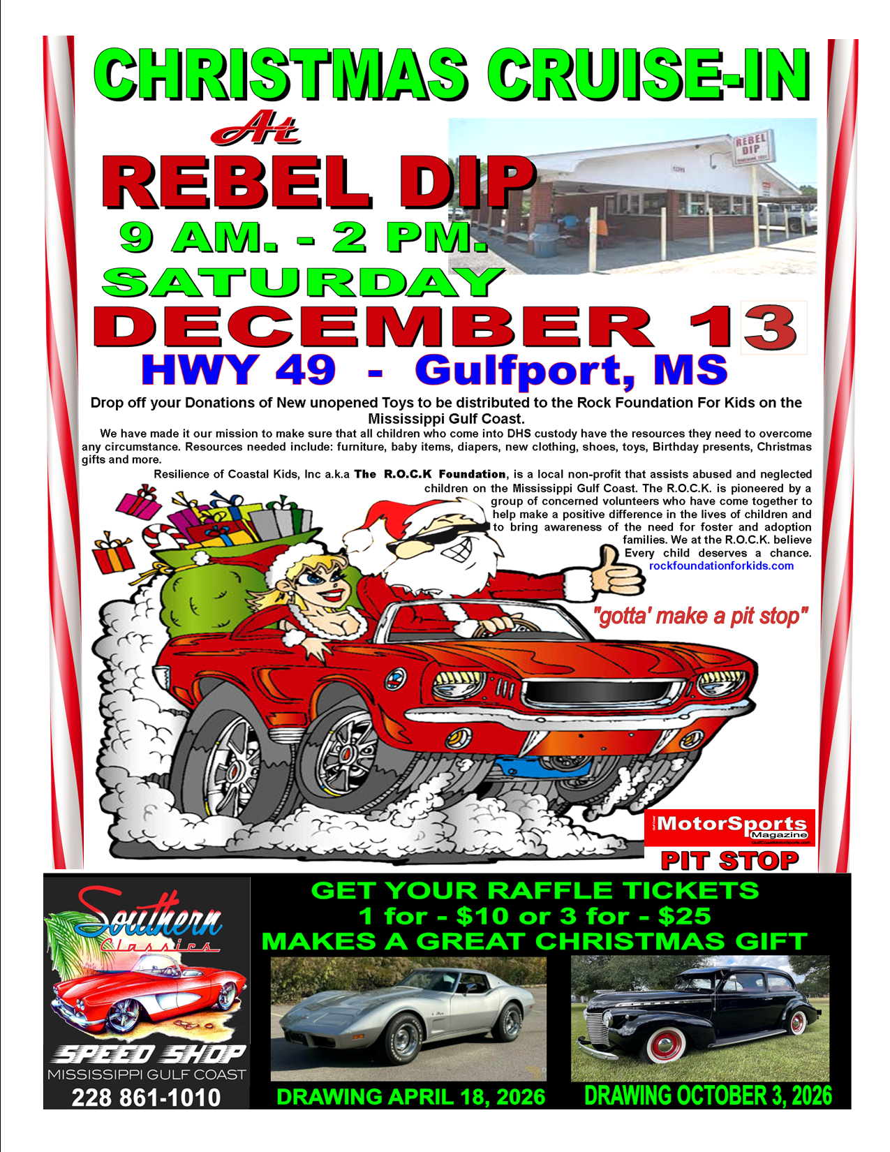 December 13 Gulfport, MS, CHRISTMAS CRUISE-IN at Rebel Dip. HWY 49 - Gulfport, MS 9am - 2pm. Drop off your toy donations of Unopened Toys to be distributed to the […]
